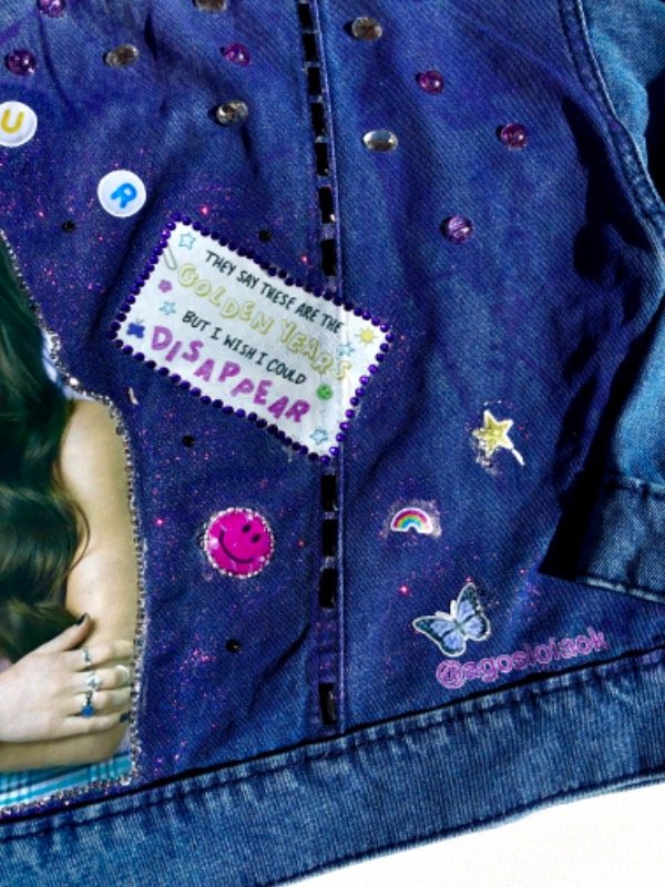 Campera de Olivia Rodrigo inspirada en el album SOUR. Parches de DTF y de lentejuela sobre tela (lado delantero) Detalles en strass y glitter. Pieza unica en stock inmediato, 50 cm de hombro a hombro.